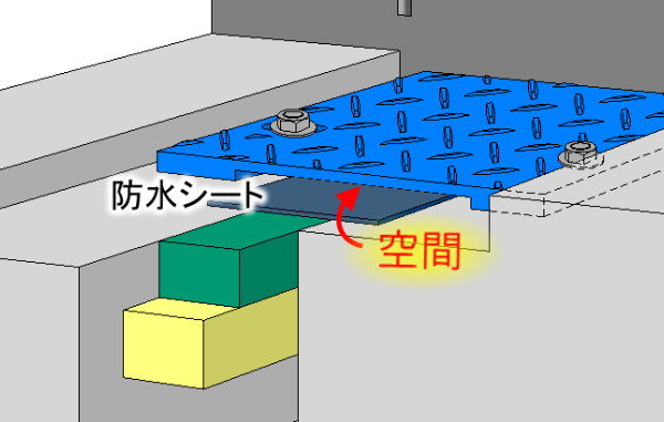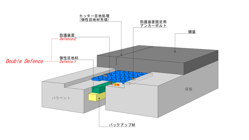 防水機能の耐久性が極めて高いダブルディフェンスジョイントは、遊間部の弾性目地材と防護装置との間に空間を設けて被覆する構により、防水部分に輪荷重が一切かかりません。